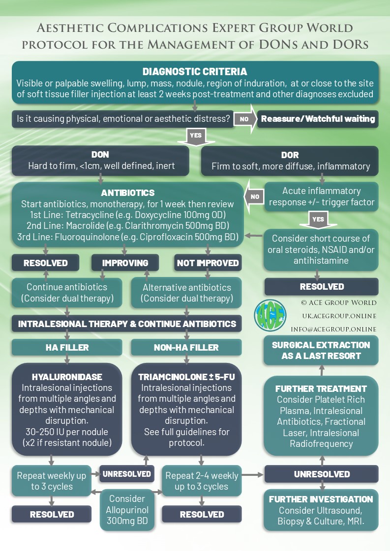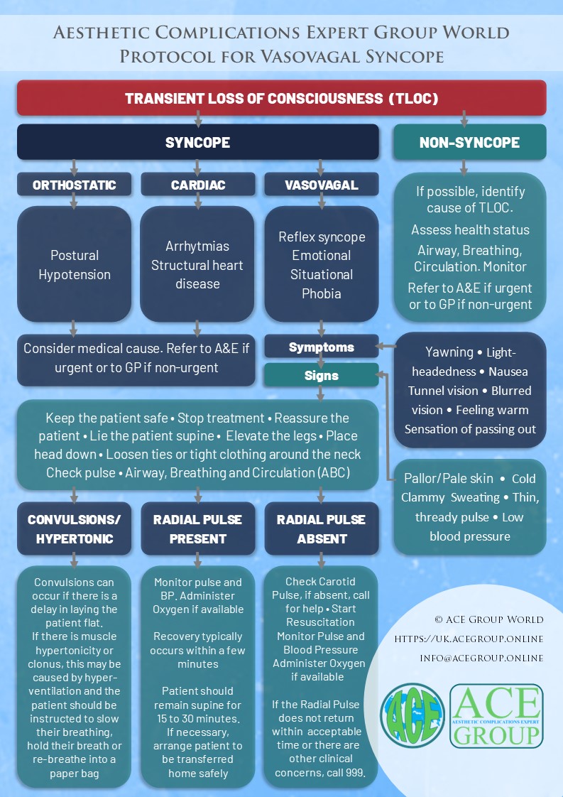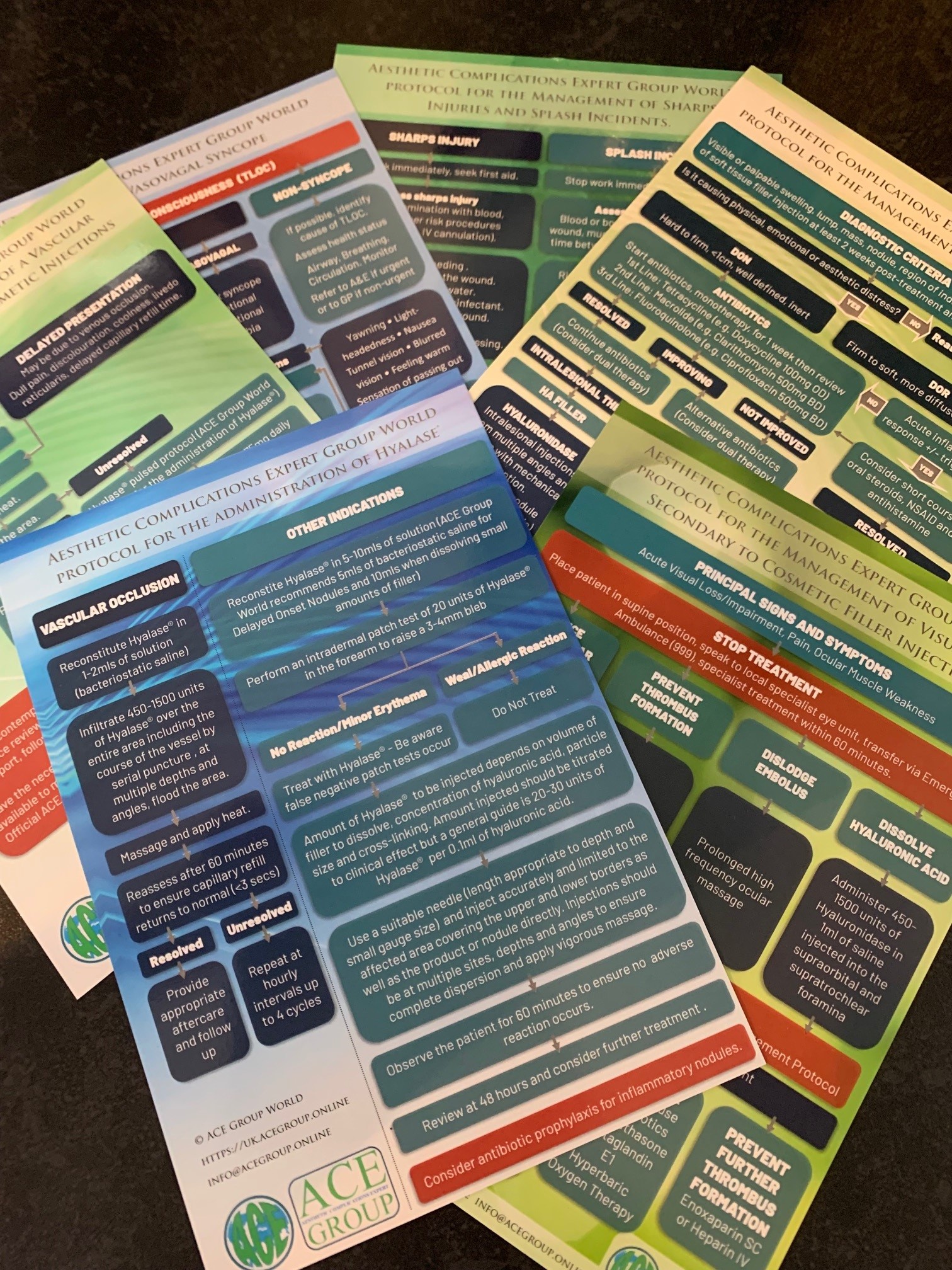 ACE Group World has produced evidence-based, peer reviewed guidelines for the management of common and serious complications that can occur in non-surgical aesthetic practice. Many of the guidelines have a summary, flowchart or algorithm at the end as a quick-start guide. ACE Group World has produced these algortihms that may be needed in the event of an emergency on 400gm gloss-laminated card, which are ideal for use in treatment rooms and on the back of clinic cupboard doses for easy reference.